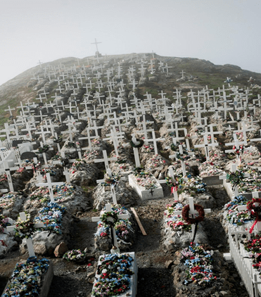 In the Sealers’ Cemetery in Greenland, the soil is too hard to bury the dead. Instead, they are laid to rest in concrete and stone-covered coffins which lie above the ground. This cemetery does not comprise of family plots but is a community of sealers. Often the coffins face the ocean, so that the sealers can watch the place where they once worked.